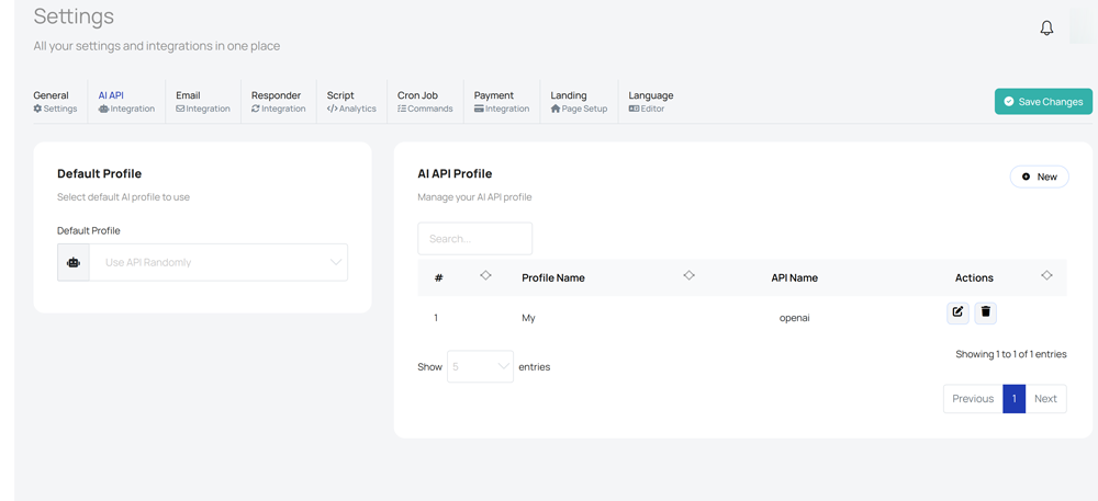To add this API key to the application, click on the New button. You have the option to include multiple API keys and specify which one you wish to utilize. Additionally, you may opt to randomly use any of the added API keys for each use. Do not forget to `Save Changes`