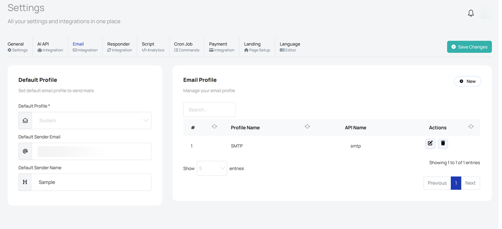 We support various email providers including SMTP, Mailgun, Postmark, SES and Mandril. To add a email profile to the application, click on the New button. Do not forget to `Save Changes`.