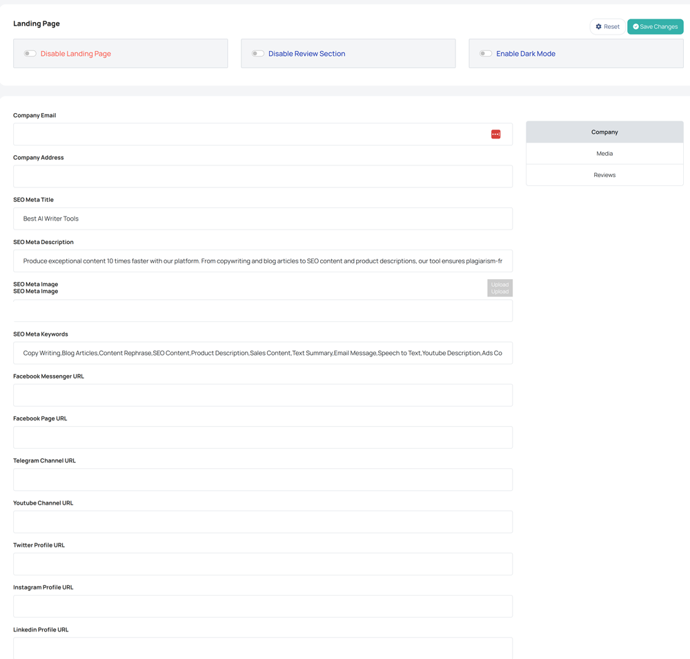 This page allows you to customize your company information and optimize your SEO meta data. You can also replace existing media on your landing page and display customer reviews to increase engagement. Use can use `Language Editor` to change landing page content which will be discussed later in this article.