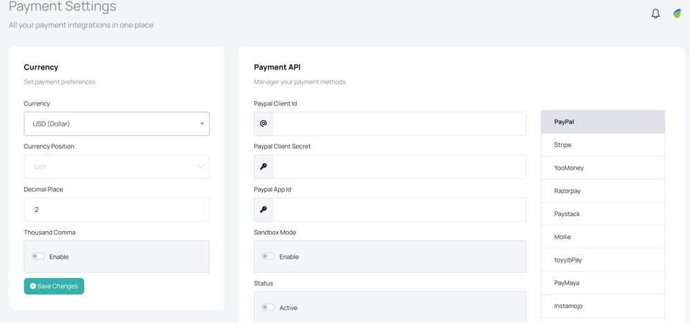 We curretly support different payment methods including PayPal, Stripe, YooMoney, RazorPay, PayStack, Mollie, ToyyibPay, PayMaya, InstaMojo, Xendit, MyFatoorah etc. Add the payment method you want to use and setup the currency and save.