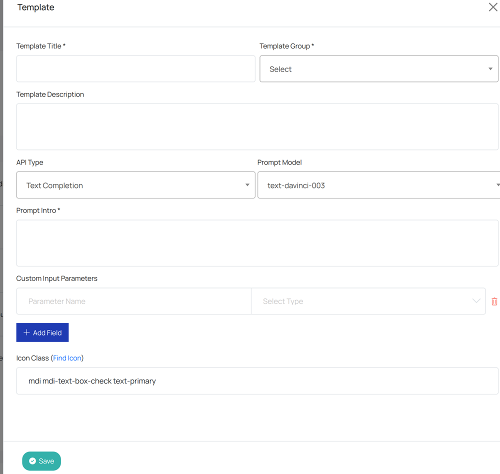 To add a template group, you only need to provide a group name. You can also add an icon class for the group using FontAwesome or MaterialIcon. The groups will be listed in order of priority based on their serial number, with lower numbers having higher priority.